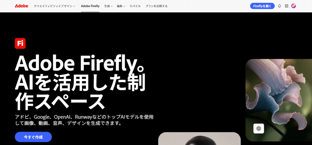 Adobe Fireflyは、Adobe社が提供する画像・動画・デザインなどの生成AIツールです。