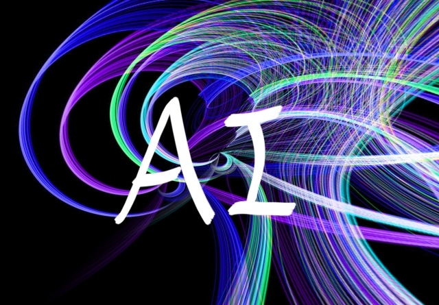 Card on a desk displays 'AI' with 'Artificial Intelligence' text, next to a keyboard and colorful sticky notes.