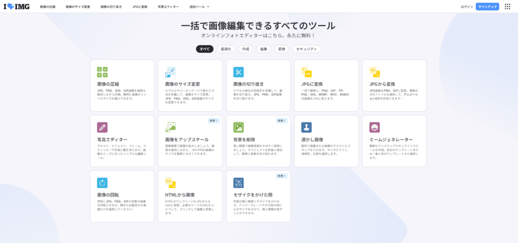 また、最適化や作成、編集、変換など画像編集機能がひと通りそろっており、ILoveIMGひとつであらゆる画像処理を行えます。