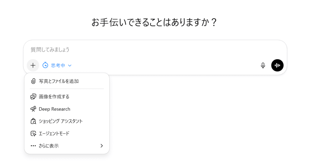 まず、公式サイトからChatGPTにログインしましょう。画面中央にあるテキスト入力画面の左下をクリックして、「画像を作成する」を選びます。
