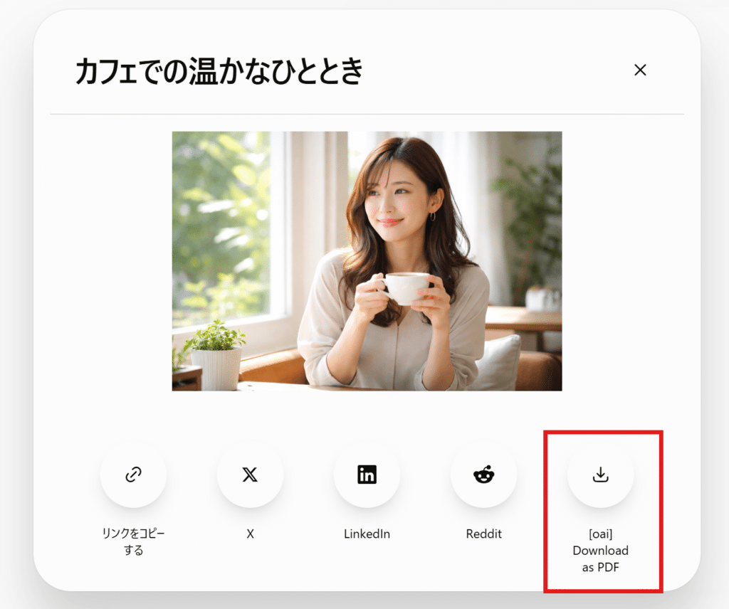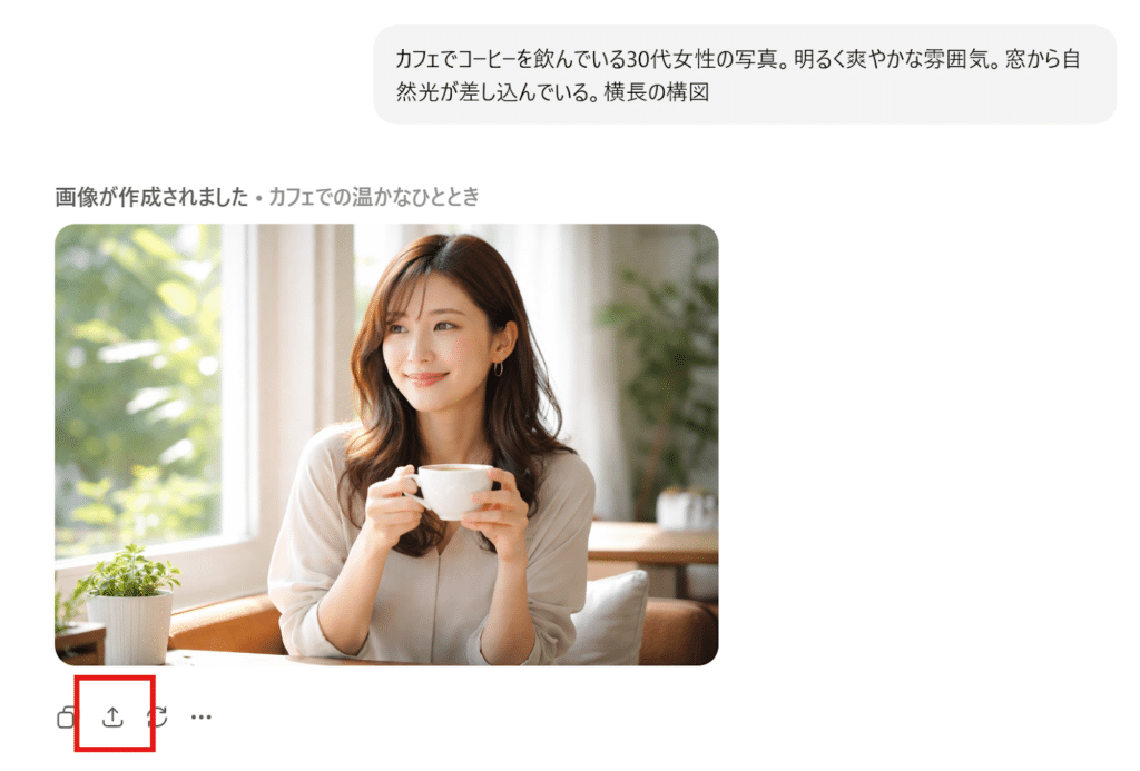 例えば、「カフェでコーヒーを飲んでいる30代女性の写真。明るく爽やかな雰囲気。窓から自然光が差し込んでいる。横長の構図」といった具合です。この程度の情報でも、ChatGPTは十分に理解し、クオリティの高い画像を生成してくれます。