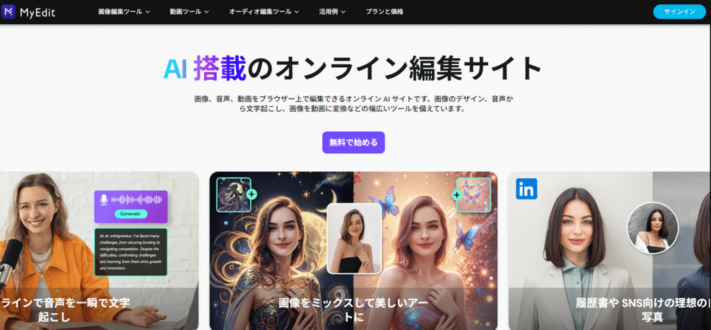 MyEditは、画像や音声、動画をブラウザ上で編集できる無料のオンラインAIツールです。JPG・PNG・GIF・WebP・BMPの多様な画像形式に対応しています。