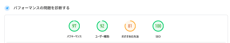 モバイル環境は通信速度や処理能力が制限されているため、多くのケースでデスクトップのスコアよりも低くなります。デスクトップの結果が良好でもモバイルでは改善が必要なこともあるため、それぞれのスコアを確認しましょう。