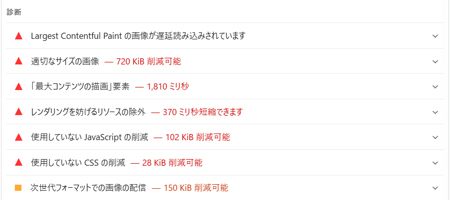 横棒グラフや指標横のマークがオレンジや赤の場合は、優先的な改善が必要なことを意味します。