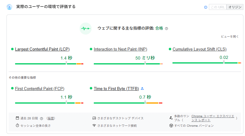 PSIでは、「実際のユーザーの環境で評価する」を通じて、実際のユーザーのネットワークやブラウザ環境でのパフォーマンスを確認できます。これはフィールドデータとも呼ばれ、CrUXによる過去28日間の実績値に基づくデータです。