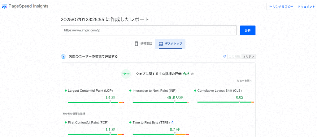 - モバイル・デスクトップ両方に対応:モバイルとデスクトップそれぞれの表示速度を個別に評価可能